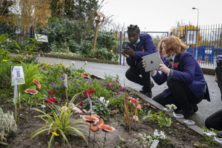(Images in order: Featured Image – Faith Smith and Dylan Binns, King Solomon International Business School, Pupils testing our the QR codes in their Sensory Garden, Abbie Vlahakis, Millennium Point CEO with Jean McLeod, Head of PSP, standing by the Sensory Garden.)